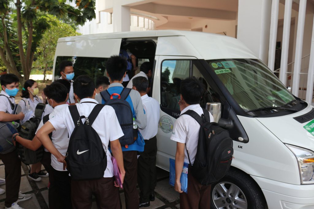 Nhà trường đưa đón học sinh khối 12 đến các địa điểm thi làm thủ tục dự thi